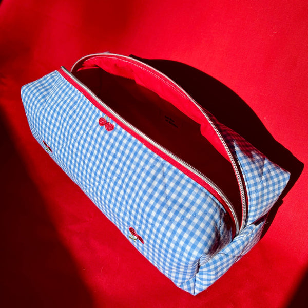 - Quilted exterior with beautiful embroidered cherries on blue gingham;